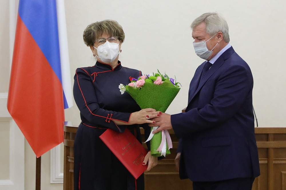 Среди награжденных было немало сельских женщин. На фото Василий Голубев вручает Почетную грамоту Губернатора Ростовской области председателю Общероссийского общественного движения сельских женщин России, уроженке Егорлыкского района Татьяне Безбудько. | Фото пресс-службы губернатора Ростовской области.